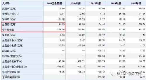 加上截止目前的6.63亿元银行债务,国裕物流集团在银行和债券市场上的债务已接近13亿元。另外,据上述最新财报显示,国裕物流集团总负债41.29亿元,资产负债率高达264.78%。而公司总负债曾在2013年飙升至55.24亿元。