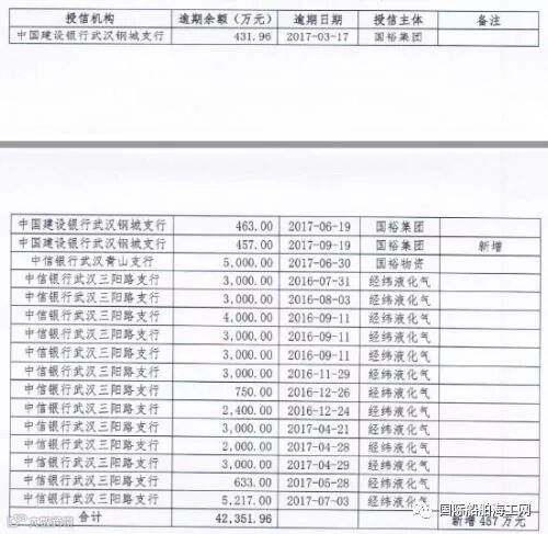 另据国裕物流集团公告,截止2017年10月9日,公司及下属子公司国裕物资、江裕海运及其下属子公司经纬液化气银行贷款逾期及欠息共计4.53亿元,其中逾期4.24亿元,欠息0.29亿元。值得注意的是,去年10月份至今短短四个月的时间,国裕物流银行贷款逾期及欠息增长了2.11亿元,是整个债务的三分之一。