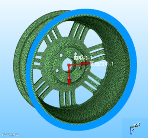 因此,本文根据GB/T 5334-2005《乘用车车轮性能要求和实验方法》的要求,基于国产自主软件PERA SIM模拟实验条件,建立某乘用车轮毂的静力学模型,对轮毂的单侧轮缘面施加固定约束,在总体坐标系下的(2.8533,-818.74,113.08)处,建立节点,并与五个螺栓孔内表面建立RBE3连接,在建立的节点上施加Z向集中载荷1400 N以及X向力矩1400 N*m。具体情况如下图所示。