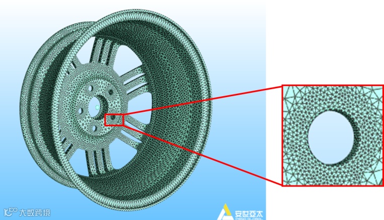 PERA SIM支持四面体网格以及混合网格划分,考虑到轮毂复杂的几何结构,本文使用高阶四面体网格划分。通过全局以及局部网格控制,对轮毂模型的局部关键位置进行网格细化,划分该轮毂模型共产生33万单元,52万节点,轮毂的网格模型如下图所示: