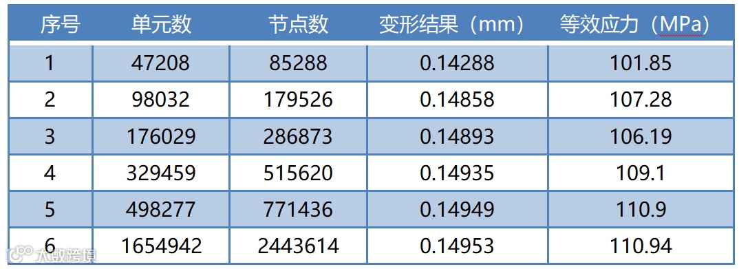 基于PERA SIM对乘用车轮毂进行有限元分析,进行网格无关性验证,并将计算结果与成熟商业软件比对。根据表1可以发现,当网格达到33万左右时,继续加密网格,变形量与等效应力基本不再变化(浮动在1%以内),因此,为平衡计算成本与计算精度,本文采用329459单元数,515620节点的网格规模。