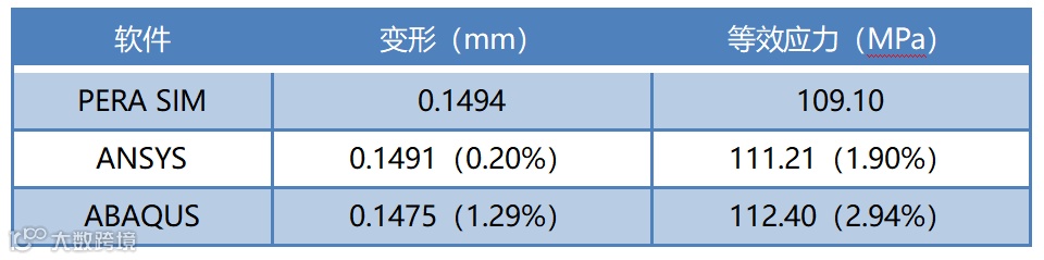 对比不同软件的计算结果,可以看到自主软件PERA SIM的计算结果(变形与等效应力)与目前主流的成熟商业软件ANSYS、ABAQUS之间的偏差极小,其相对误差均在3%以内,验证了国产自主软件PERA SIM的高精度计算。