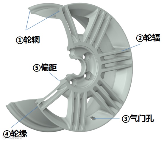轮毂是汽车承载的重要部件,处于轮胎与车桥之间,传递着汽车与地面之间的相互作用力,起着承载、转向、制动、驱动等重要作用,因此轮毂对汽车的安全性及可靠性有着重要的影响。而轮毂主要分为三种材质:钢制、铝合金及镁合金。其中钢制轮毂主要用于重载车辆;镁合金轮毂因其价格昂贵,主要用于赛车等高级车;而铝合金轮毂因其良好的导热性、减震性能、质量轻、成形性好等优点备受市场的青睐。(铝合金轮毂的基本结构示意图如下图1所示。)