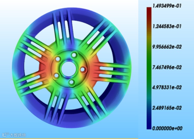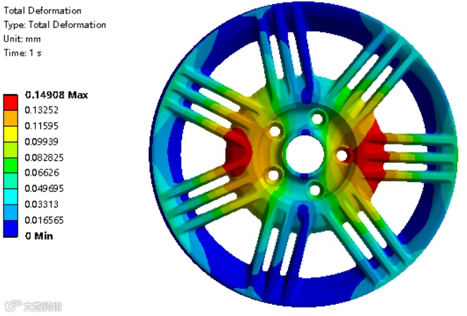 如上图所示,在外载荷的作用下,轮辐受到的影响最大,螺栓孔的边缘处承受较大的应力,与实际情况相符,最大应力为109.1 MPa,远小于铝合金的屈服强度240 MPa,因此本文中乘用车的轮毂仍有较大的强度裕度,轮毂整体的最大变形量为0.1495 mm,满足要求。因此,可以对轮毂做进一步的优化设计,减轻轮毂自重。