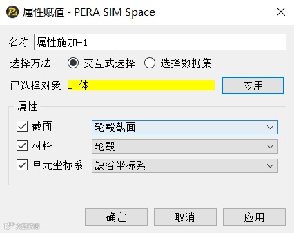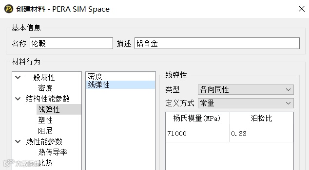 点击“属性”,输入轮毂的材料属性,定义为各项同性的线弹性材料,其中弹性模量:7.1E10 Pa,泊松比:0.33,密度:2770 kg/m3。定义轮毂的截面属性,并将材料属性与截面属性一同赋予给轮毂结构。