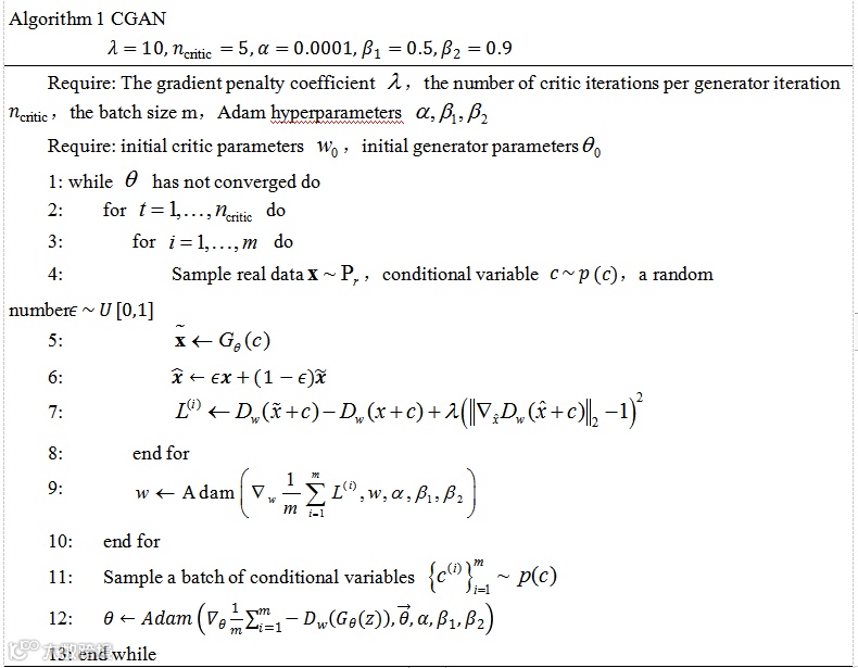 传统的条件GAN会引入噪声,并且将噪声与条件进行拼接作为网络输入,本文所提出的CGAN去掉了噪声,只输入条件。训练过程中,判别器每训练5次,生成器训练1次。整体算法流程描述如表2.1所示。