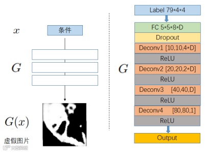 去噪的CGAN模型由生成器和判别器两部分组成,其中生成器的网络结构如图2.3所示。我们参考Pix2pix GAN中的设计,去除随机噪音,直接将长度为1264的条件编码作为生成器的输入,这提高了模型训练的稳定性。输入数据首先经过全连接层,变成 的一维向量,其中是通道数的权重,可根据设备内存大小进行调整。全连接层后的是为了避免训练过程过拟合所设置的随机删减Dropout层,经过Dropout层的数据被重构成 ,再经过反卷积层Deconv,其中反卷积层后的激活函数为Relu激活函数。经过4层反卷积运算,生成器最终得出[80,80,1]的灰度图。