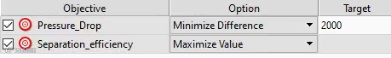 在优化过程中定义压力损失和灰尘预分离效率两个优化目标量。由于参数化模型与最终产品设计有所区别,因此考虑一定的余量,定义压力损失的优化目标为最接近2000 Pa,为此单独定义压力损失的约束为小于2000 Pa。灰尘预分离效率的优化目标定为最大化。图5为优化目标。