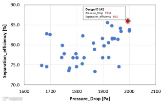 在满足可行性的37个优化模型中,根据压力损失和分离效率的关系图,选择最优的优化结果。图9为压力损失与灰尘预分离效率的关系图。Design ID 142和Design ID 149为分离效率最高的两个设计, Design ID 149压力损失为1912 Pa,Design ID 142压力损失为1994 Pa,两者相差不大,所以最终选择灰尘预分离效率最高的Design ID 142为最优的设计结果。