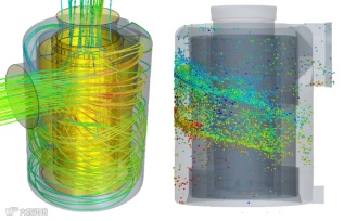 为此进行了两次CFD计算,图12显示的是压力损失分析中速度流线的结果以及灰尘预分离分析中颗粒分离的结果。