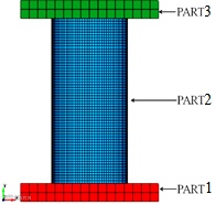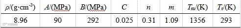 刚性墙PART 1、冲击块PART 3均为刚体,材料为Q235钢,薄壁圆筒为紫铜。Q235钢的密度为7.83×103 kg/m3,杨氏模量为210 GPa,泊松比为0.33。紫铜的仿真参数见表1。
