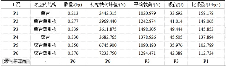 (1)对比六种工况的吸能指标,双管双肋板的初始峰值载荷最大,单管双肋板的平均载荷最大且吸能总量最多,单管的比吸能最高,这说明肋板提升结构承载能力的同时也降低了比吸能。