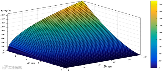 上式(8)中,壁厚δ通常很小,其平方项更小,故可以略去。对于给定材料,其屈服应力是已知和确定的,此处设为单位1 Pa。取壁厚δ和半径D为自变量,采用Matlab编程对式(8)进行了曲线绘制,结果见图2。由此可以看出,影响产生折皱的主要因素是薄壁圆管的半径、壁厚及材料的屈服应力。