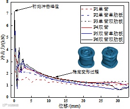 所有结构底端的材料流动模式或者说变形模式相同,可以采用J.M. Alexander的理论模型加以描述。对比P1、P2、P3三种工况,圆管的变形程度和等效应力峰值依次减小,薄壁圆管的屈曲方式均相同,均为内卷折皱,这说明肋板加强了结构的刚性,提高了结构的抗冲击变形能力。对比P1、P4两种工况,单管结构较双管结构变形大,等效应力峰值也较大,双管结构的内外管屈曲变形相似,这说明双管中内管分担了一些冲击力。对比P4、P5、P6三种工况,很明显地看到双管单和双肋板结构的屈曲方式与双管结构的屈曲方式差别很大,等效应力峰值上升,且应力峰值的分布范围减小。就P5和P6两种工况而言,其等效应力峰值相同,但屈曲方式不尽相同。表现为:双管单肋板结构内管上部出现收缩的皱褶,两半肋板发生S型屈曲,且屈曲方向相反,内管与外管的底部变形模式类似;双管双肋板结构内管的上部未出现收缩的皱褶,而是有发展成圆环褶皱的趋势,其肋板屈曲方式与双管单肋板结构肋板的屈曲方式相同,其内外管的底部变形也与双管单肋板结构内外管的变形方式相同。双管单肋板结构内管上端的屈曲属于典型的钻石模式,而双管双肋板结构内管上端的屈曲属于圆环模式。对于钻石模式,上文中J.M. Alexander的折皱理论解法便不再适用,需进一步更改或修正。在实际的工程问题中,J.M. Alexander理论模型考虑的弯曲能和膜力能是不全面的,还应考虑摩擦能和热能的耗散。