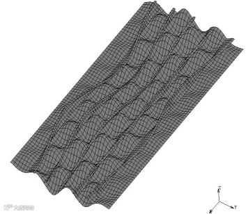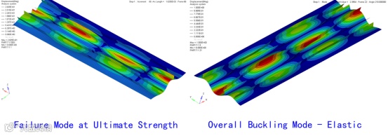 中国船级社从2013年开始系统开展了高级屈曲评估方法的研究及COMPASS-ABA高级屈曲分析软件开发。为了深入理解加筋板结构的力学特性,建立了标准化的有限元模型及计算分析流程,并在ABAQUS上二次开发了自动化的特征值及非线性有限元建模和计算分析软件(COMPASS-ABA-NLFEM)。考虑到加筋板结构的屈曲及极限强度对于初始缺陷的敏感性,采用了通过特征值局部屈曲分析及假设的总体缺陷叠加给出的复杂初始缺陷,如图5所示[3]。通过与IACS相关实验结果的比较,验证了该有限元计算分析流程和软件的正确性。