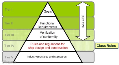 船级社早期的规范主要是来源于设计经验和营运反馈的经验型规范。如世界上最早的英国劳氏船级社,距今已有300多年历史,其对于航运船舶的评级和船舶设计规范最初就是基于航运人士和保险商在劳氏咖啡馆的综合信息交流建立的。当今,随着船舶大型化、新船型要求的快速迭代、以及轻量化等优化设计要求的出现,基于传统设计、营运反馈的经验型规范已经无法满足行业快速发展的现状及激烈竞争的市场需求。伴随着结构强度通用分析技术的发展,船体结构规范正快速从经验型规范向理论型规范转变。同时,国际海事组织(IMO)主导的行业全球监管要求的提高,尤其是海上安全委员会(MSC)在2010年提出了如图2所示目标型规范体系(GBS)要求之后,更加快了这一转变的步伐。