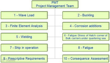 散货船油船共同结构规范(CSR)是IACS各个成员船级社共同建立的一套先进的船体结构规范,是满足IMO目标型规范要求(GBS)的第一套船体结构规范。该规范是在原有的IACS散货船共同结构规范(CSR BC)和油船共同结构规范(CSR OT)基础上,通过尽可能协调对船体结构强度的规范要求而建立的,并于2015年推出实施。为此,在IACS的统一组织下建立了10个专题项目组,开展了近5年的研究,如图10所示[2]。该规范总体包括两大部分,第一部分为油船、散货船共同的结构规范要求,包括屈曲规范以及总布置设计、结构设计原则、载荷、船体梁强度、船体局部构件尺寸要求、舱段直接强度分析、疲劳、上层建筑及甲板室和舾装、建造、营运船舶换新衡准等规范要求;第二部分为依据散货船和油船结构的特点,分别给出的一些额外规范要求。