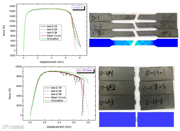 为了得到LS-DYNA中*MAT_024材料需要输入的有效应力-有效应变曲线,首先需要对试验数据工程应力-应变曲线进行处理,将其转化为真实应力应变曲线,并且在颈缩后,通过不同的硬化公式进行插值外推,得到完整的真实应力应变曲线,进而代入LS-DYNA中进行计算,模拟拉伸试验过程,通过仿真计算,得到力-位移曲线或者工程应力-应变曲线,并与试验数据进行对比,看结果是否一致,如果一致,说明输入曲线能够反应材料的真实性能,如果不一致,就需要调整输入曲线,直到结果与试验数据一致。