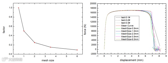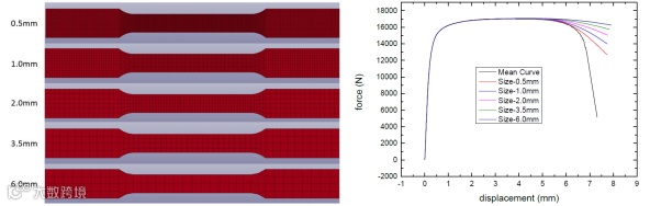 网格的虚假依赖性是失效分析时要考虑的问题,在局部紧缩之后,材料的变形往往集中在很小的区域,大的网格尺寸会导致结构偏刚,而在碰撞分析时,所需的网格尺寸较大,需要将失效曲线进行缩放。
