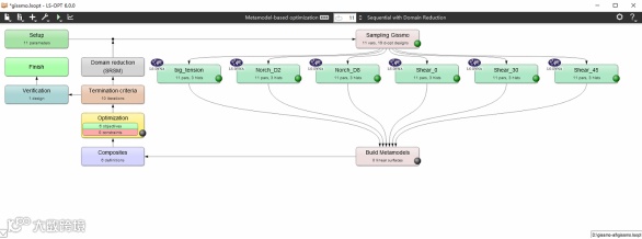 GISSMO模型中需要确定的参数包括:失效预测曲线,不稳定性曲线,损伤累计指数n和应力衰减指数m。根据多组不同应力状态的试验拟合出这些失效参数是一个复杂的过程,工作量大,使用不断试错的方法很难得到与实验结果匹配较好的模拟结果。随着计算机科学的发展,使用数值优化的方法进行参数识别是一个比较方便的方法。LS-OPT能够与LS-DYNA进行交互,操作简单,因此本文采用LS-OPT进行失效参数的识别,流程图如下: