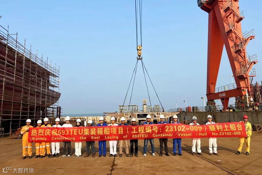 公司承建的693TEU集装箱船4#船于12月4日顺利上船台,标志该船进入船台分段合拢阶段。