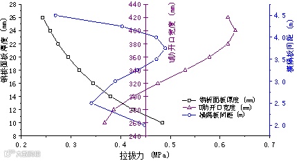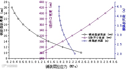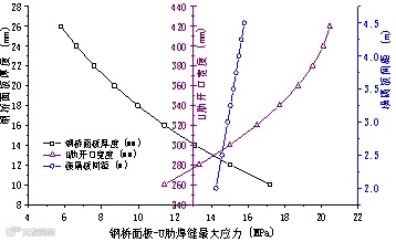 在最不利荷位基础上开展钢板构造参数对铺装层拉应力的影响研究,计算结果见图11。