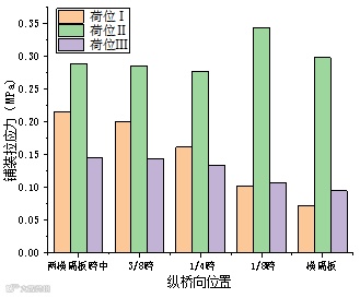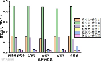 由图5分析可知:界面粘结力在横桥向由大到小依次为荷位Ⅱ>荷位Ⅰ>荷位Ⅲ,即轮载中心与焊缝位置重合时应力最大;荷载位于纵桥向两横隔板跨中时,剪应力取得最大值,为0.457MPa。荷载位于横隔板正上方时,拉拔力取得最大值,为0.063MPa。与其它荷位相比,最不利纵横桥向荷位下的界面剪应力最大高出2.54倍,竖向拉拔力最大高出2.32倍,荷位对界面粘结力影响显著。