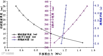 在最不利荷位基础上开展钢板构造参数对界面粘结力的影响研究,计算结果见图6~图7。