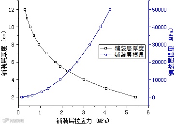 铺装层厚度和模量是铺装结构的主要参数,分别采取铺装层厚度范围2cm~12cm、铺装模量范围50MPa~50000MPa,保持单一变量,开展铺装结构参数对控制指标的影响研究,计算结果见图4。
