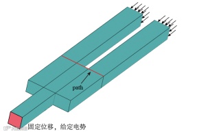 最后一个算例为某智能压电音叉的力-电耦合分析。其几何外形图及其在Freman中的分域如图12所示。音叉的底部为固定约束,并给定电势为0。在其两端面,给定均布压力为。音叉材料的正交各向同性智能材料,其相关的物理属性值见表1。
