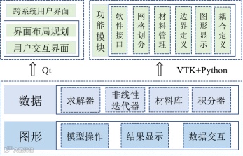 一个高质量的数值仿真软件包括数值计算、数据整理和图形界面这三大模块。在数值计算模块,采用分域的自由单元法,分为强/弱两种不同形式进行计算。在图形界面领域,基于PyQt5设计GUI窗口,并采用VTK进行三维模型显示及后处理。基本的CAE软件框架如图4所示。