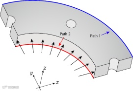 继承于上一个算例,本算例是一个热-固耦合问题,所采用的几何模型为5.1中所使用的模型,温度边条件见5.1节。此外,由于对称性,模型的几个对称面施加对称边界条件,模型的内壁面是在压力载荷为。针对此热-固耦合问题,经过计算,所得的总位移云图和von-mises云图如图10所示。此外,在路径1上比较了与有限元计算所得位移的趋势,如图11所示。从图中可以看出,弱形式算法与FEM计算所得结果吻合较好。