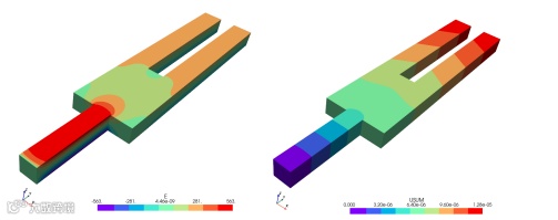 图13. Freman计算所得音叉的电势云图和总位移云图