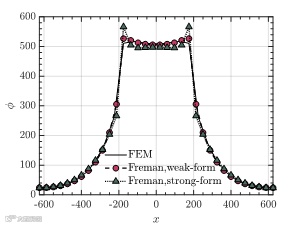 根据Freamn的分域结果,在软件中进行计算。采用的平均网格尺寸为40,分别采用强形式和弱形式两种算法。同时,采用相同网格的有限元进行计算。经过计算,Freman弱形式所得电势云图和总位移云图如图13所示。与此同时,针对三种不同的算法,对指定路径上的节点值进行比较,得到如图14和图15所示的曲线图。从图中可以看出,无论是电势还是位移,弱形式算法所得结果与有限元所得结果十分接近。因此,在以后的分析中,应当使用弱形式进行分析。