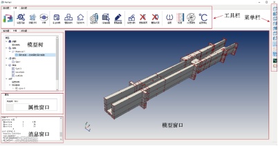 通过设计图形用户界面(GUI),用户可以更便捷地使用仿真软件进行计算。考虑到用户群的特点,自由单元法采用跨平台图形界面开发程序Qt的python版本,开发如图5所示的图形用户界面。用户界面参考了大部分现有的商业软件,并针对用户习惯及多场耦合分析顺序做出相应的设计调整。图5中给出了软件的几大窗口,用户可方便的通过GUI对模型进行操作分析。