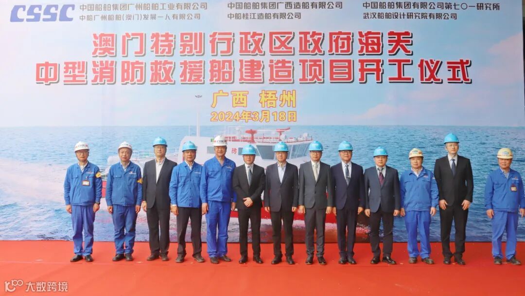 举行开工仪式。澳门海关黄志勇处长,澳门海事及水务局胡俊业处长,公司党委书记、董事长欧传杰,副总经理曾令强,副总经理兼桂船公司党委书记、执行董事谈卫,中国船舶集团