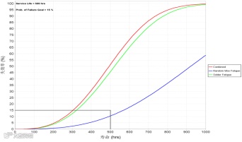 e) 可靠性预计:根据概率分布计算温循和振动失效分布曲线和综合可靠性失效曲线如下图11所示。可看出振动失效曲线(蓝色)比温循失效曲线(绿色)平缓,其与合格判据(500小时,15%失效率)矩形右侧边相交,说明满足寿命和失效概率要求;温循失效曲线与合格判据矩形上侧边相交,说明其不满足寿命和失效概率要求,温循失效是导致印制板组件可靠性低的主要问题。