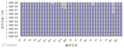 c) 温循寿命计算:选择温度循环条件和焊接材料,根据其内置经验公式计算印制板组件元器件热疲劳寿命,也可以引入印制板组件的热仿真云图作为其温升条件(见图5)。计算结果如下图6、7所示,可以得到每个元器件的温循寿命,红色代表寿命不达标器件。