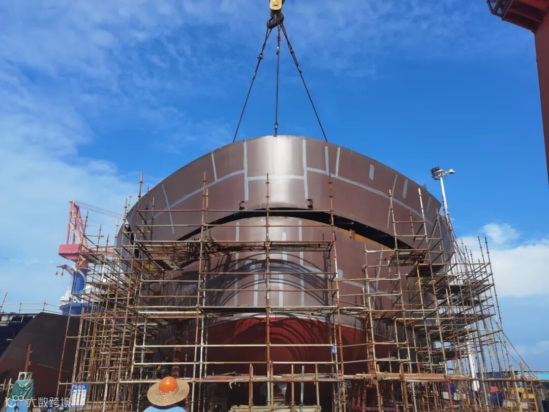 11月3日,造船事业部建造的693TEU集装箱1#船802分段搭载完成,标志该船主船体顺利贯通。造船事业部带领党员干部职工冲锋在前,加强与技术、质量、安全等部门沟通联动,动员施工班组加班赶工,并提前制定吊装作业指导方案,认真做好船台生产准备,在同期实施109米滚装船等项目分段搭载、两船设备进舱等工作的同时,确保了该船主船体每个分段的顺利搭载。
