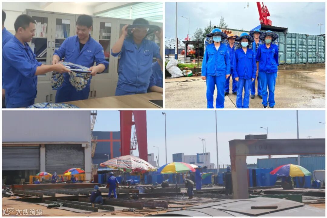 酷暑当头,为改善现场施工条件,公司各分会为在现场各露天施工点施工的一线职工送上遮阳帽、遮阳伞。