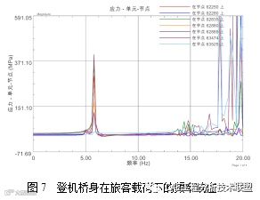 图7是登机桥身的几个关键点的应力在旅客行走载荷下的频率响应曲线。从图中可以看出,在5.8Hz时,应力将出现第一次突变。一般而言,人行走的频率是2Hz左右,所以该结构对旅客载荷激励是安全的。