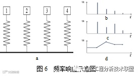 频率响应是用来描述系统对激励响应的曲线,此响应可以是加速度、速度、位移和力[4,5]。例如:考虑安装于振动台上的四个单自由度弹簧质量系统,频率分别是f1、f2、f3及f4,而且f1< f2< f3< f4。如果振动台以频率f1激振并且四个系统的位移响应都被记录下来,结果将如图6b所示。现在再增加频率为f3的第二种激振并记录下位移响应,系统1及3将达到峰值响应,如图6c。如果施加包括几种频率的一种综合激振并且仅记录下峰值响应,就将得到图6d所示的曲线,这种曲线称为频谱,也称为响应谱。