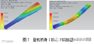 模态分析是所有动力学分析类型的最基础的内容,并且也是其它更进一步动力分析的起点。它是用来确定结构的振动特性的一种技术[3]:自然频率、振型、振型参与系数(即在特定方向上某个振型在多大程度上参与了振动)。登机桥模态分析可以使我们在以下几个方面获益:①使登机桥固有频率远离旅客行走频率;②可以认识到登机桥结构对于不同类型的动力载荷是如何响应的;③有助于在其它动力分析中估算求解控制参数(如时间步长)。登机桥身模态分析中,同样约束旋转平台和约束行走机构的Z方向自由度,采用集中质量、Lanczos法提取特征值,获得前10阶频率分别为(Hz):3.14、5.06、5.83、10.34、10.58、11.04、13.18、13.36、13.92、14.46。图5是登机桥身的1阶和3阶振型。