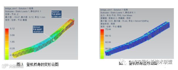 从图中可以看出,桥身的最大位移为19.47mm,最大应力为75.44Mpa,满足结构刚度与强度的要求。