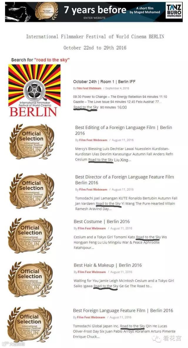本片入围2016年第7届柏林制片人国际电影节,登录第七届柏林制片人国际电影节官网,我们惊喜地发现《情比山高》获多项提名:最佳外语片、最佳服装、最佳造型、最佳剪辑.....。电影节10月22日已开幕,本片将于10月24日在柏林举行观影活动,应该有奖项收入囊中,而不仅仅是提名。