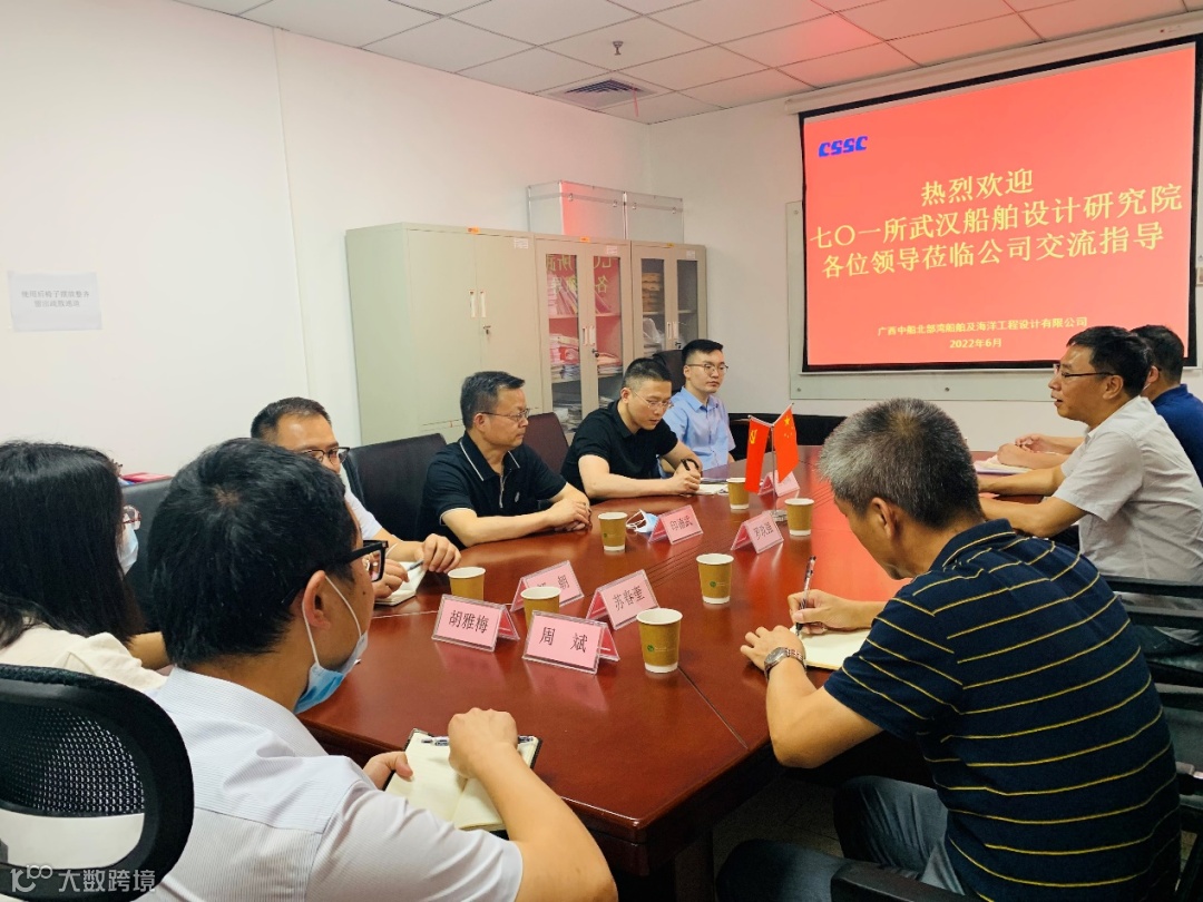 近日,中国船舶集团有限公司第七〇一研究所机关党委书记印德武一行到中船广西公司所属设计公司,就科研课题、产品研发、技术交流、人才培养等方面的合作进行交流。中船广西公司党委委员、副总工程师、设计公司董事长罗玖强,设计公司总经理邱春良,七〇一所所属武汉船舶设计院副院长孙晓晖参加交流座谈会议。
