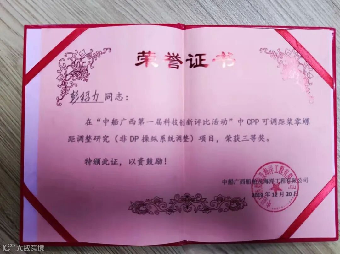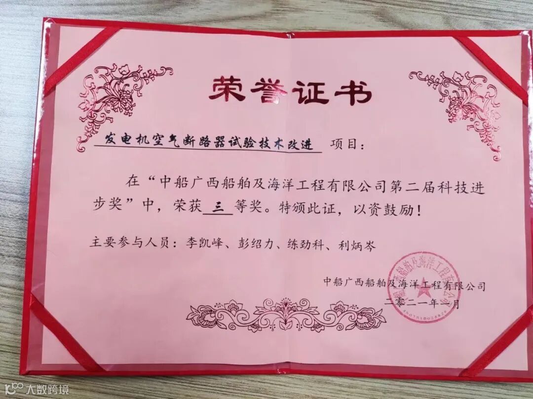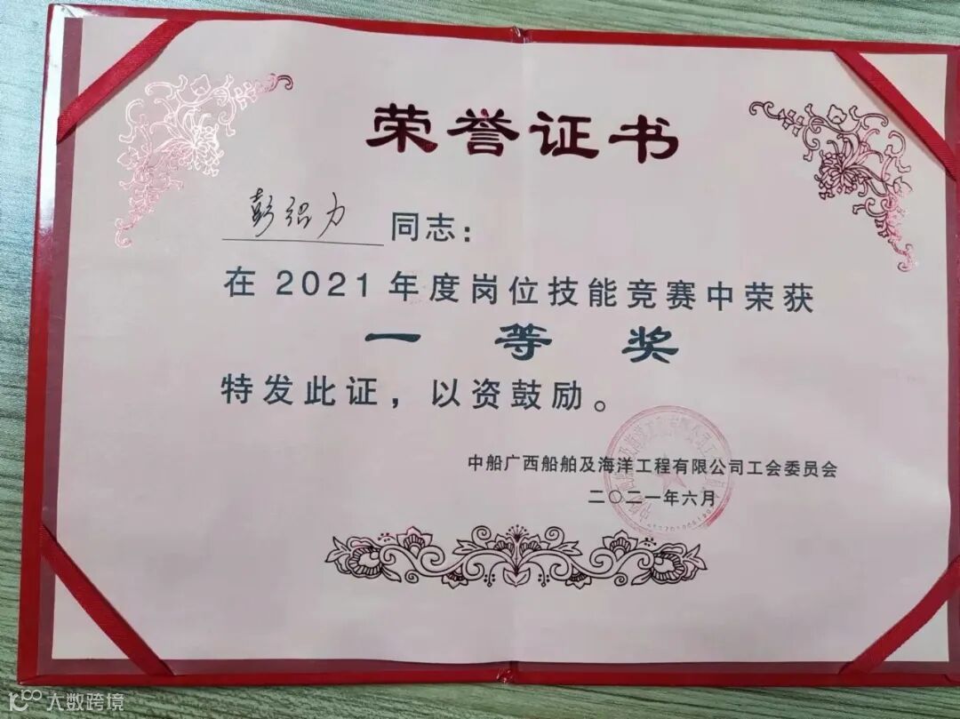 这位不到24岁的“靓仔”,2016年4月入厂至今凭借着个人出众的能力,扎实的专业技能已经取得众多“战绩”。2021年获得“中船广西公司岗位技能竞赛”船舶电工组第一名,2019年、2020年作为工匠创新工作室创新组成员连续两年获得“公司科技创新三等奖”,其所在班组获得了“中船集团广州地区青年文明号”、“中船集团公司青年文明号”、“中船集团公司质量信得过班组三等奖”、“广西公司优秀班组”等称号。