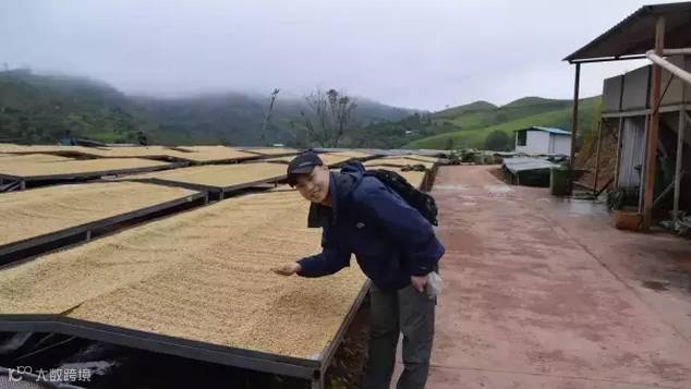 由於當地人個子較矮,所以一切設施都很低,我撞了幾次頭。在加工廠裡,真的可以聞到葡萄酒發酵的味道,很好聞。咖啡生豆的曬場上面,很多工人們在將咖啡生豆翻曬,向他們打招呼,他們也非常的熱情。白廠長耐心的為我們講解處理咖啡漿果的每一個工序,處處感覺到他的專業性極高!他對我們前方的出品也很感興趣,我們一直聊,氣氛很融洽。白廠長說,雲南這裏氛圍罕季和雨季,現在很適合曬豆子。