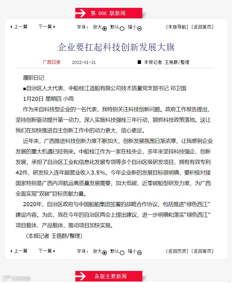 中船广西1月21日,广西壮族自治区第十三届人民代表大会第五次会议胜利闭幕,自治区人大代表、中国船舶集团广西公司所属桂船公司技术质量党支部书记邓卫国以《企业要扛起科技创新发展大旗》为题,书写自己的履职日记,发出中船铿锵之声。