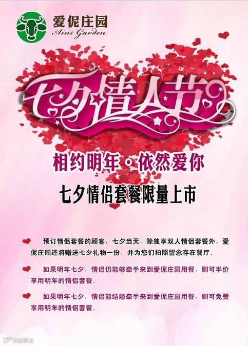 如果明年七夕,情侣仍能够牵手来到爱伲庄园用餐,则可半价享用明年的情侣套餐。
